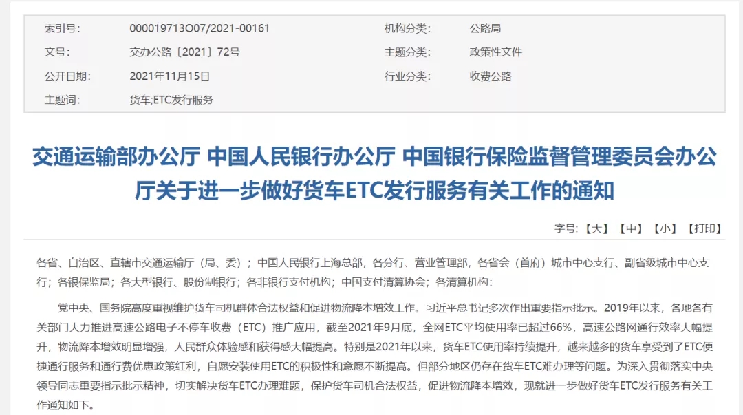 11月15日,交通運輸部辦公廳、中國人民銀行辦公廳、中國銀行保險監(jiān)督管理委員會辦公廳聯(lián)合發(fā)布《關(guān)于進(jìn)一步做好貨車ETC發(fā)行服務(wù)有關(guān)工作的通知》:
