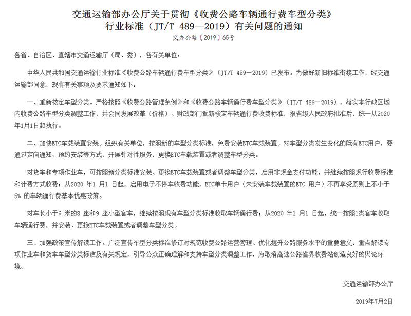 中華人民共和國交通運(yùn)輸行業(yè)標(biāo)準(zhǔn)《收費(fèi)公路車輛通行費(fèi)車型分類》(JT/T 489—2019)已發(fā)布,落實(shí)本行政區(qū)域內(nèi)收費(fèi)公路車型分類調(diào)整工作,并會(huì)同發(fā)展改革(價(jià)格)、財(cái)政部門重新核定車輛通行費(fèi)收費(fèi)標(biāo)準(zhǔn),報(bào)省級(jí)人民政府批準(zhǔn)后,統(tǒng)一從2020 年1月1日起執(zhí)行。
