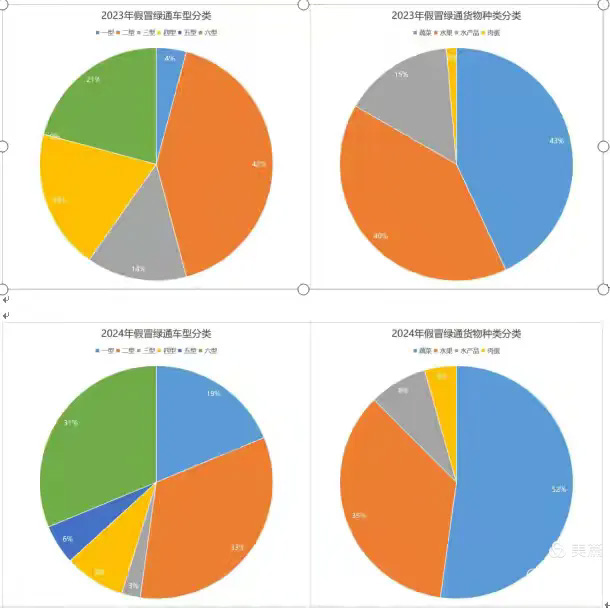 3.自集團(tuán)“綠色通道”車輛專項(xiàng)治理工作要求以來(lái),鄭庵收費(fèi)站精細(xì)化梳理排查假冒綠通類別,針對(duì)性強(qiáng)化查驗(yàn)。假冒綠通車型和貨物種類分類如圖: